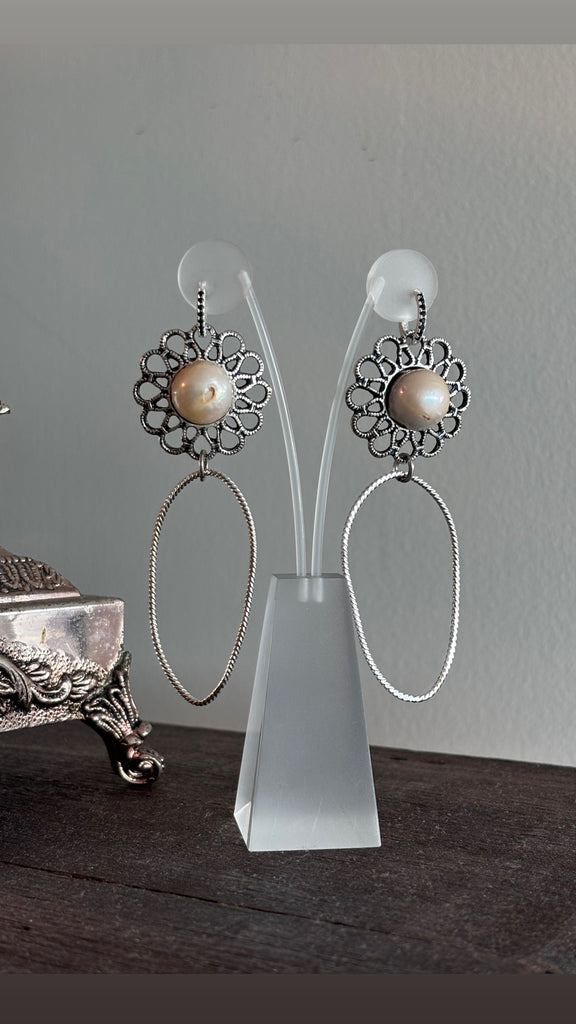 Suspended below is a natural baroque pearl, each one unique and one of a kind, celebrated for its organic shape and soft, luminous glow. A twisted silver hoop enhances the sense of movement and contemporary grace.
