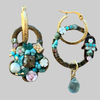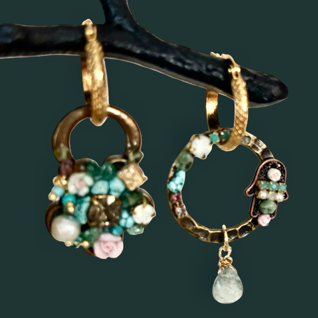 Handcrafted asymmetrical earrings — each piece uniquely designed with a mix of vintage textures, warm brass, and shimmering crystals.