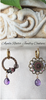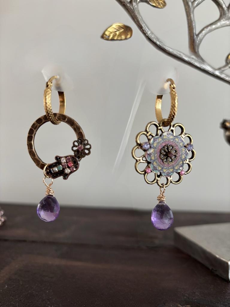 On one side: a textured hoop with delicate ornamental details and a purple amethyst drop.