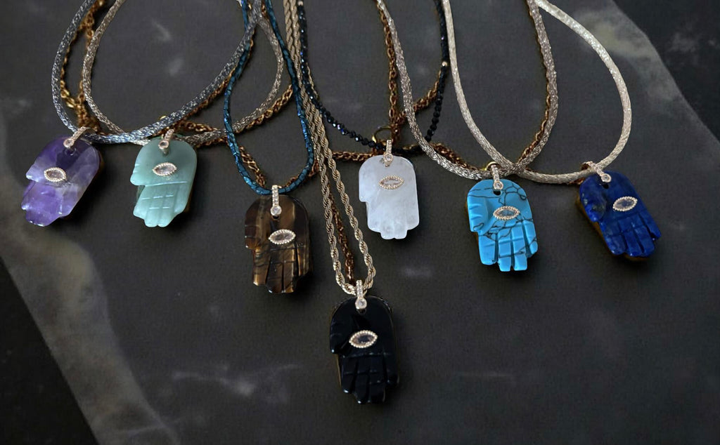 A curated collection of hand-carved Hamsa pendants, each made from a natural gemstone that carries its own unique energy of protection, calm, and personal strength.