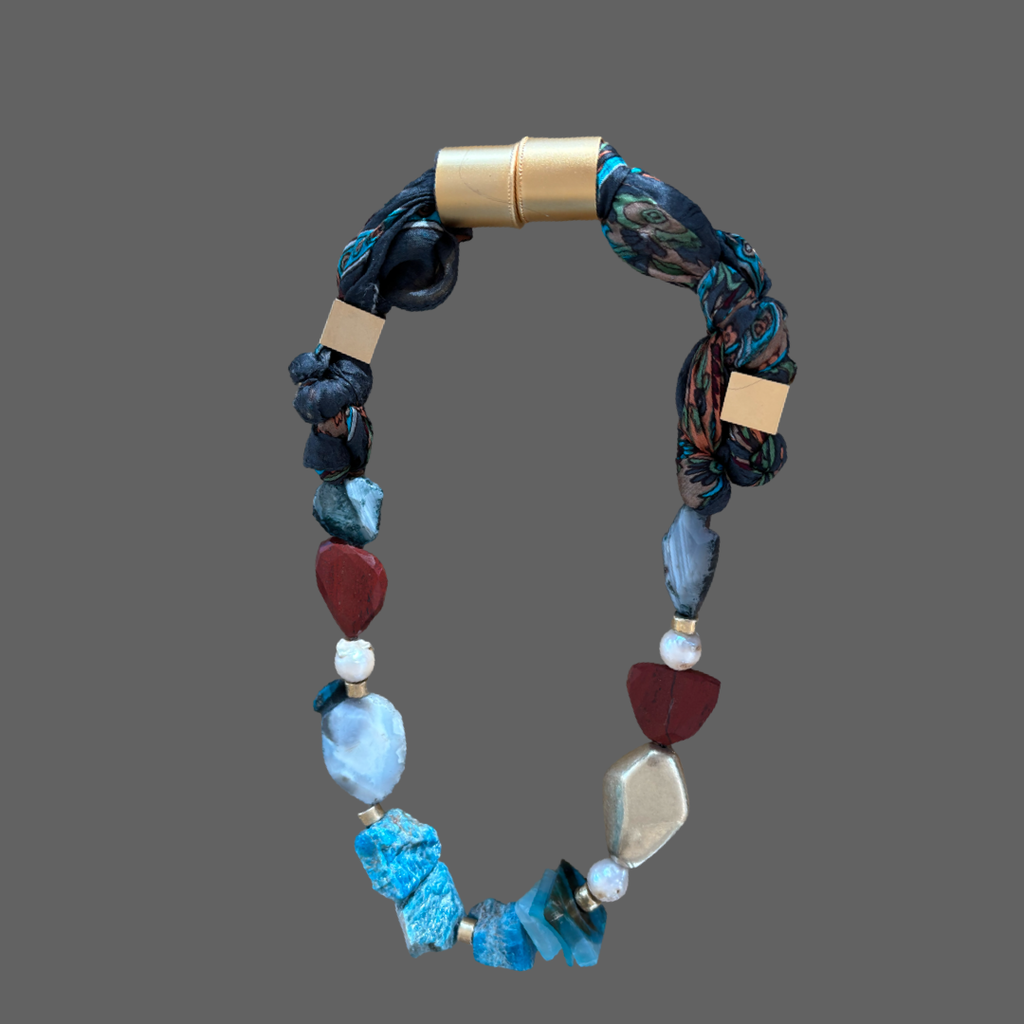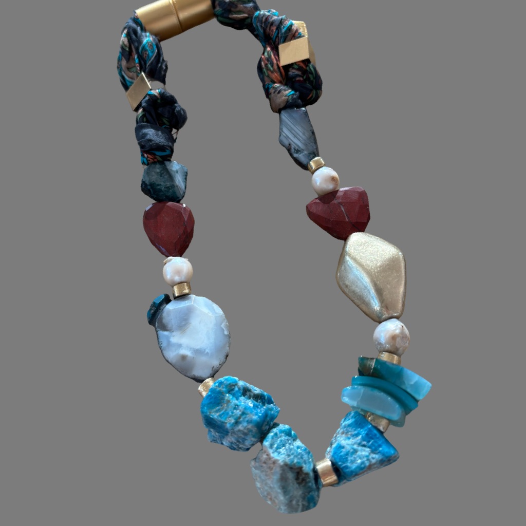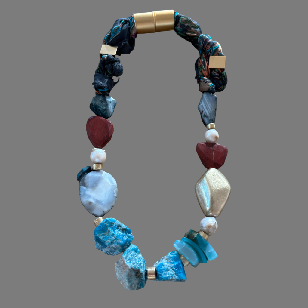 A striking, one-of-a-kind statement necklace featuring turquoise and deep-blue kyanite, combined with natural agate, organic baroque pearls, and warm accents of red jasper.