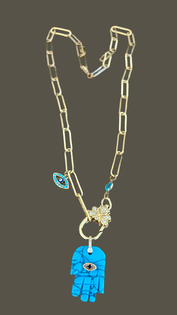 This piece features a bold turquoise-style carved Hamsa, accented with a sparkling zirconia eye for intuition and protection.
