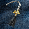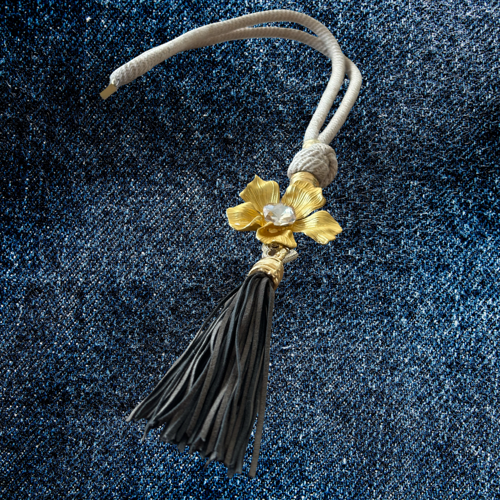 This versatile statement necklace features a brushed gold-tone flower accented with a sparkling crystal, a soft cotton cord, and a dramatic black leather tassel. Designed to transform with your mood and outfit, this piece can be styled in multiple ways — from bold statement to minimal elegance.