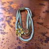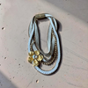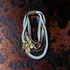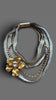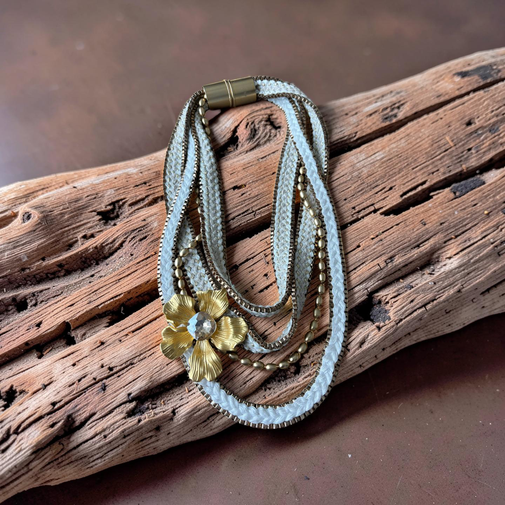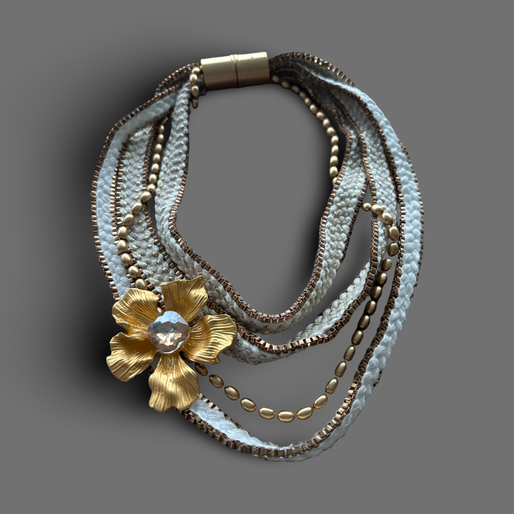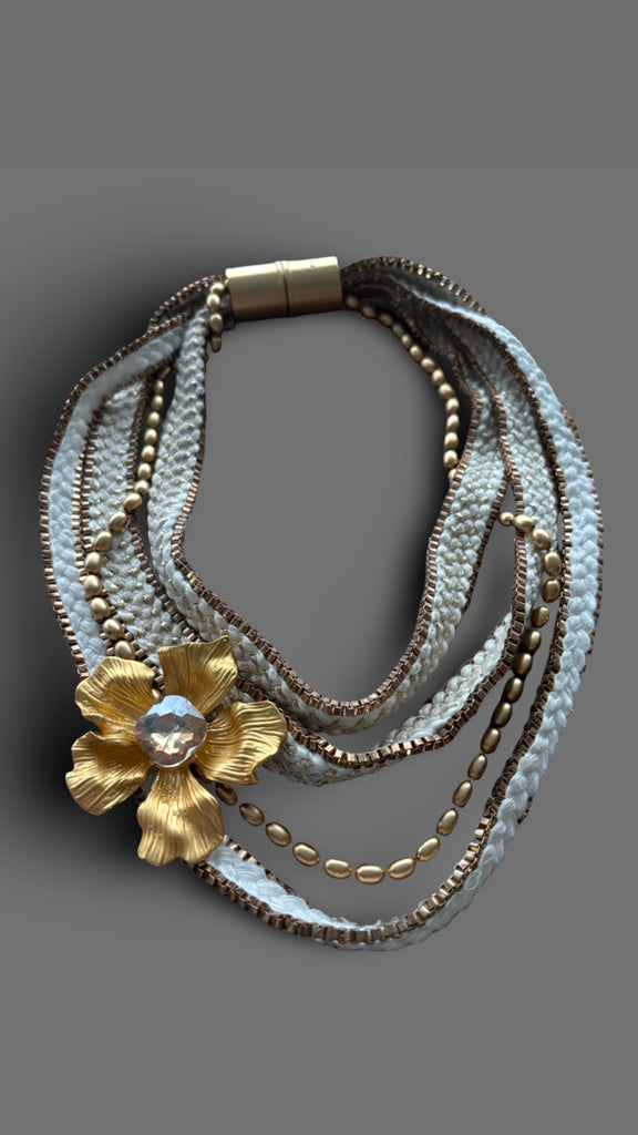 This one-of-a-kind statement necklace blends texture, movement and shine. Layers of hand-braided white cords, gold chains and metallic beads create depth and richness, while the sculptural golden flower with a sparkling crystal center becomes the focal point of the piece.