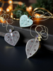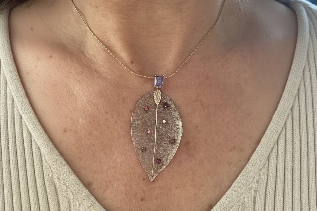 A delicate elongated leaf pendant crafted from ultra-thin metal, adorned with tiny multicolored zircon accents that shimmer softly with every movement. Finished with a subtle lavender-toned crystal bail, this piece evokes elegance, intuition, and gentle strength.
