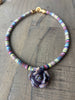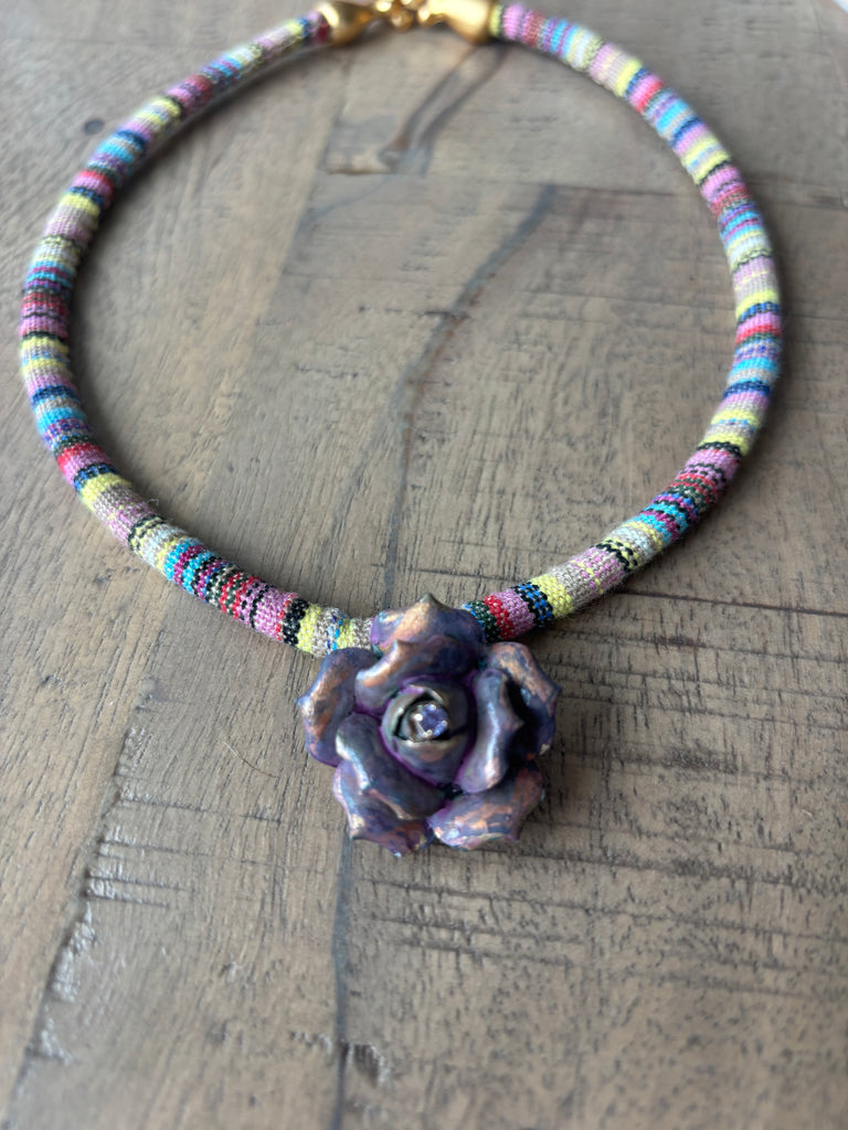 This one-of-a-kind piece blends earthy textures with feminine flair. The richly colored cord evokes the spirit of global craft, while the rose brings a sense of softness and strength. Wear it to add artistic soul to any outfit – from linen dresses to simple white tees.