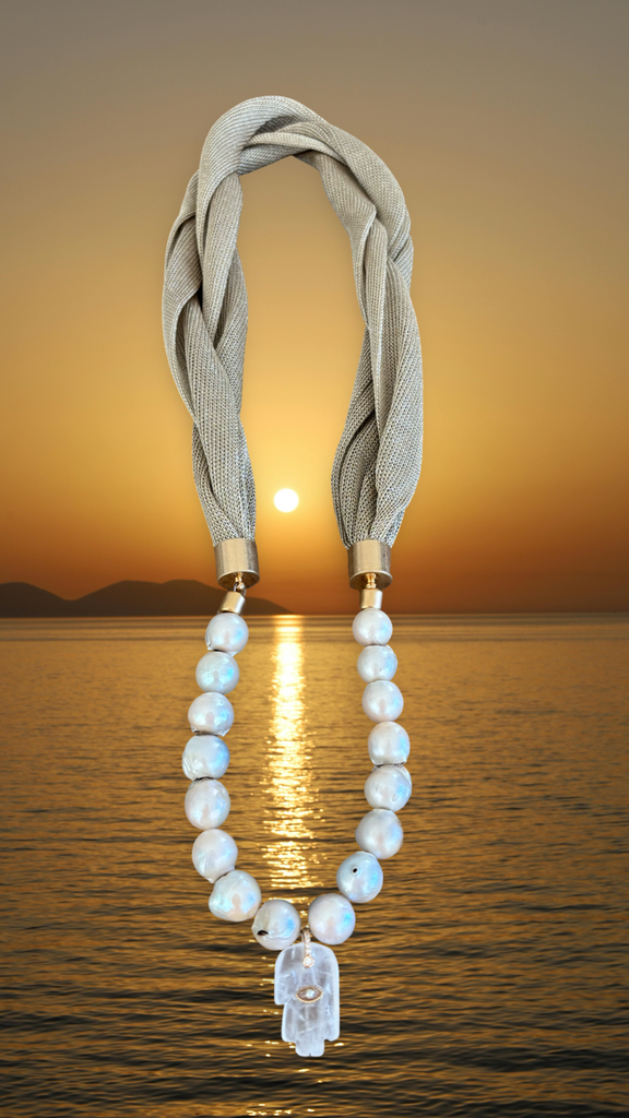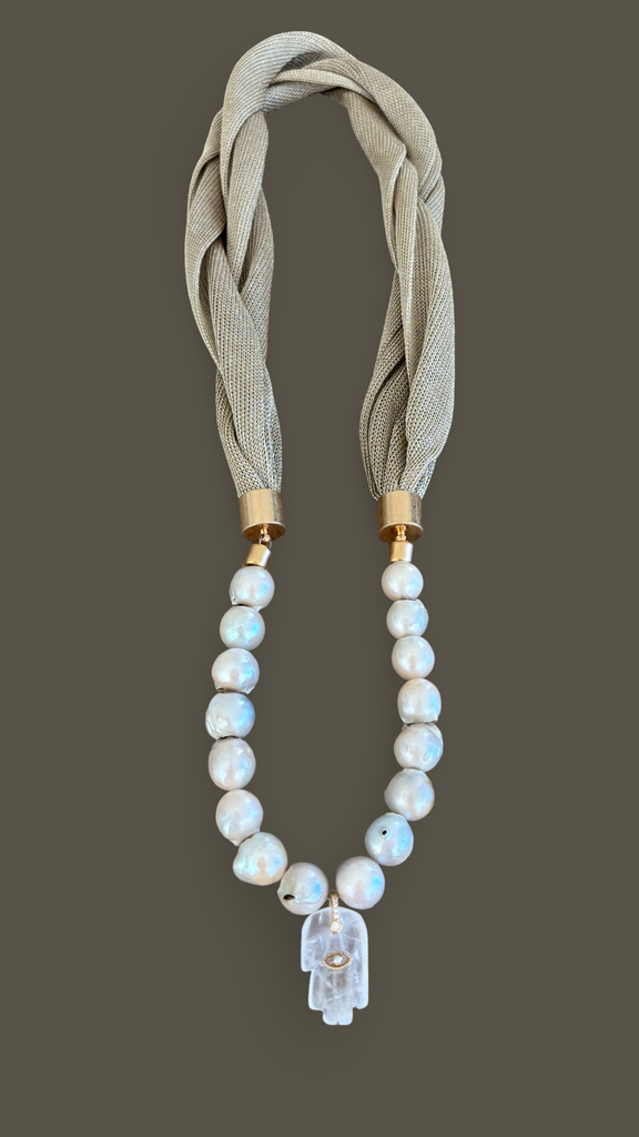 This necklace features luminous baroque pearls, each uniquely shaped by nature, paired with a hand-carved crystal Hamsa set with a delicate zirconia eye for protection, clarity, and inner light.