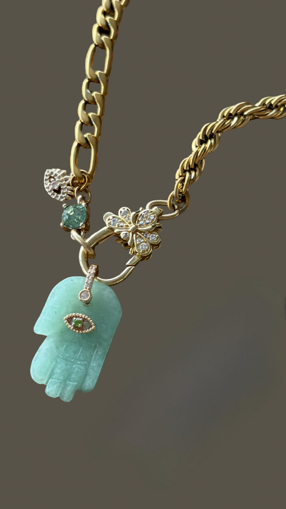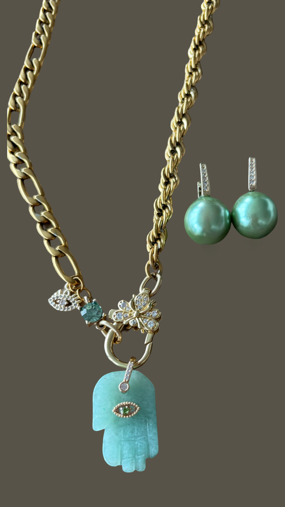 At its center hangs a hand-carved aqua stone Hamsa, symbolizing guidance and protection, adorned with a sparkling pavé zircon Evil Eye for an added layer of light and intuition.