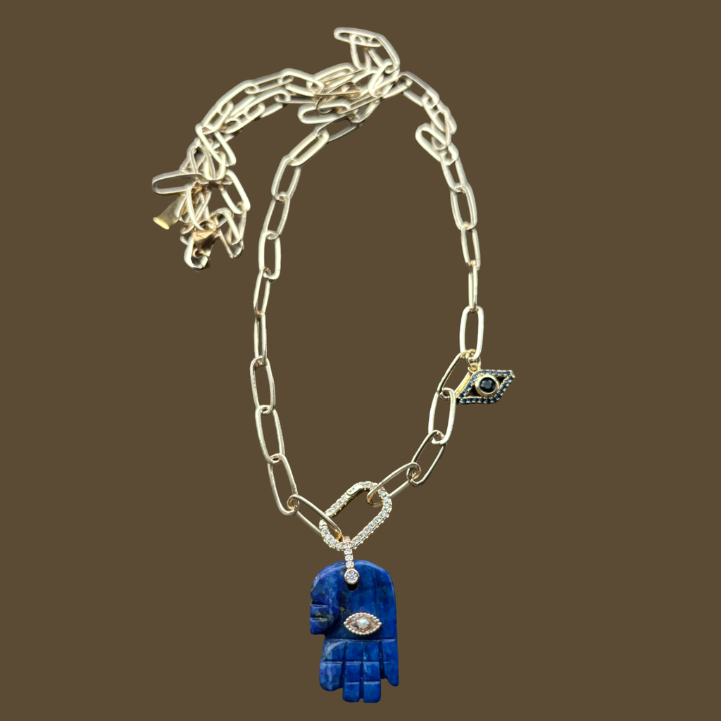 The centerpiece is a hand-carved Hamsa pendant made of deep blue Lapis Lazuli, known as a stone of protection, truth, and inner vision.